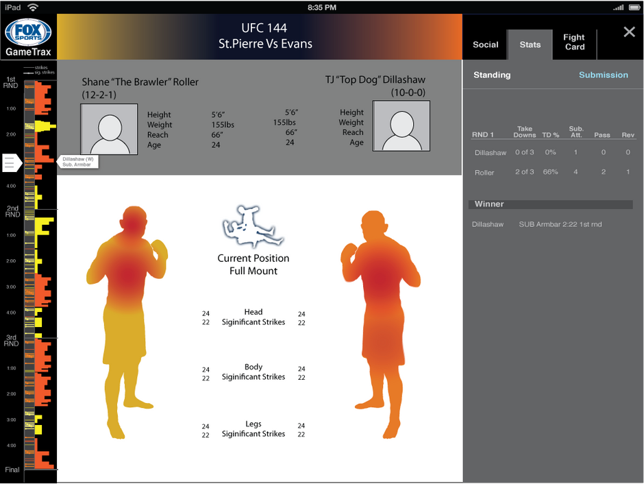 For round three of the wires we added a social tab, a scrubbable timeline, more detailed fighter stats and a more dynamic punch location indicator.